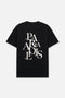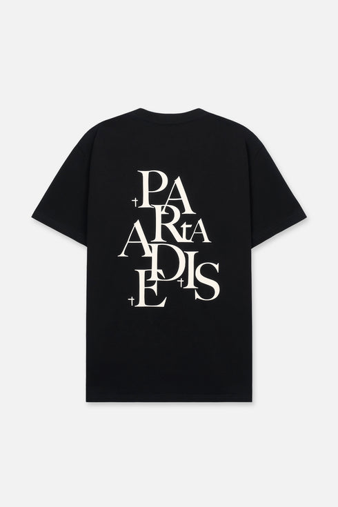 The Liam Short Sleeve Tee in Black Paradise is a regular fit, crew neck tee made from 100% cotton featuring a small RTA logo on the chest and a deconstructed PARADISE graphic, stacked and staggered in an abstract layout with the signature RTA crosses.