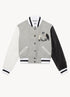 Long sleeves varsity jacket in black and grey featuring embroidered Opening Ceremony logo at chest. Pocket at side. Buttons closure. Rib knit collar, cuffs and hem.