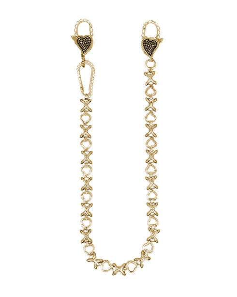 A xoxo link pant chain featuring a branded carabiner with a branded WSC® heart closure. The "Radiant Heart" logo is a historic keepsake of the brand's original studio fire in 2016.
